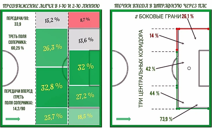 Выделю еще один аспект: продвигающие передачи в финальной трети. Левая часть изображения ниже - два уровня продвижения через пас в трети поля соперника (в какой зоне заканчивается передача вперед от Феликса):