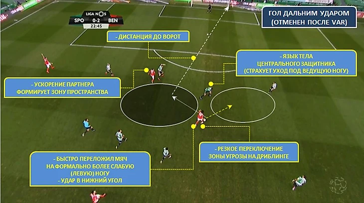 Представленный здесь гол был отменен из-за фола на игроке «Спортинга» за несколько секунд до удара, но ситуация показательна: расстояний не боится, формально более слабой ноге «доверяет», предварительную работу по созданию ударной позиции провел резкой сменой направления.