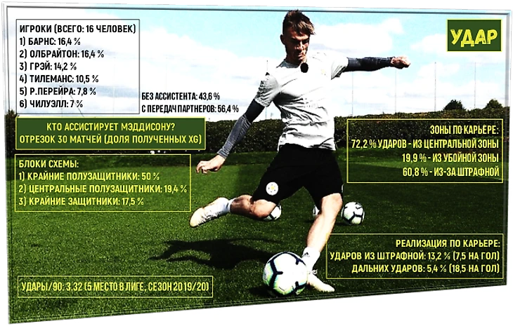 Аналогично распределению созидательной нагрузки самого Мэддисона (кому создает, xA), но в обратном направлении (кто создает для него) – по персоналиям, блокам, доля от общего с ассистентом и без. Ударная нагрузка большая – на уровне пяти лучших по всей лиге. Порой излишняя вера Мэддисона в удар (сумма тяжелых попыток, с левой ноги или значительной дистанции) может и вредить команде.
