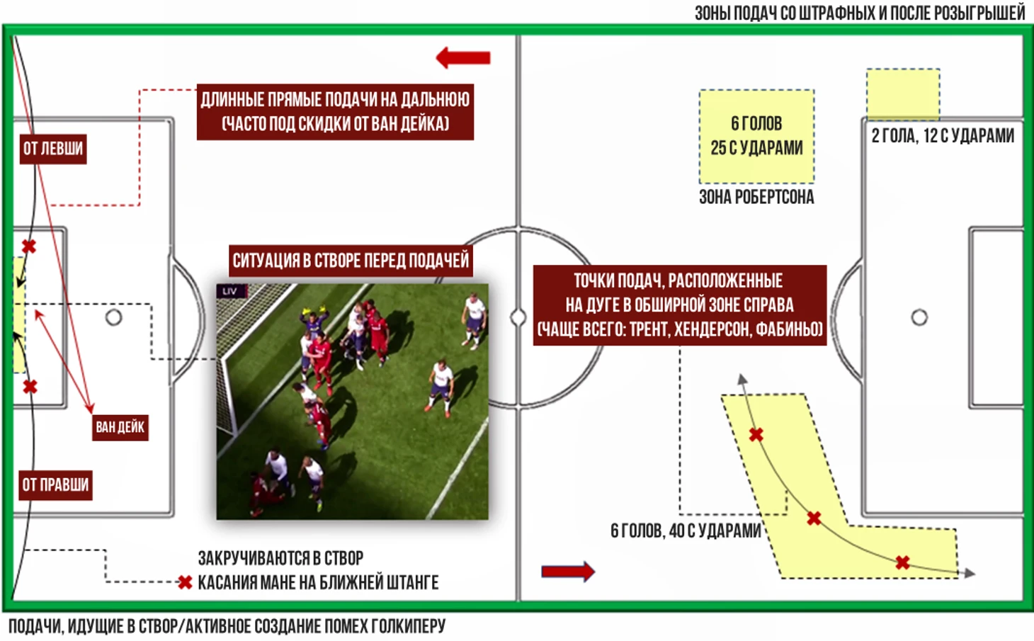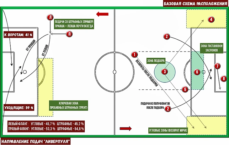 Наличие в обойме подающих и качественных правшей, и качественных левшей, позволяет «Ливерпулю» варьировать траектории. Например, при известном розыгрыше, когда подача идет в створ, а вратарская забивается максимальным количеством футболистов (слева):