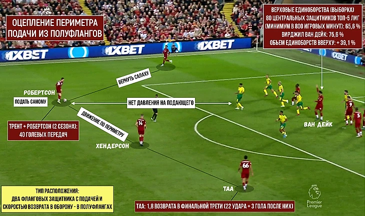 Обратите внимание на статистику верховой борьбы Ван Дейка (который уже заказывает очередную подачу жестом) и наличие у Робертсона опций для продолжения дополнительной волны стандарта. В этом эпизоде интересно сочетание зоны подбора: Хендерсон в середине и два фланговых защитника с прекрасными подачами в полуфлангах.