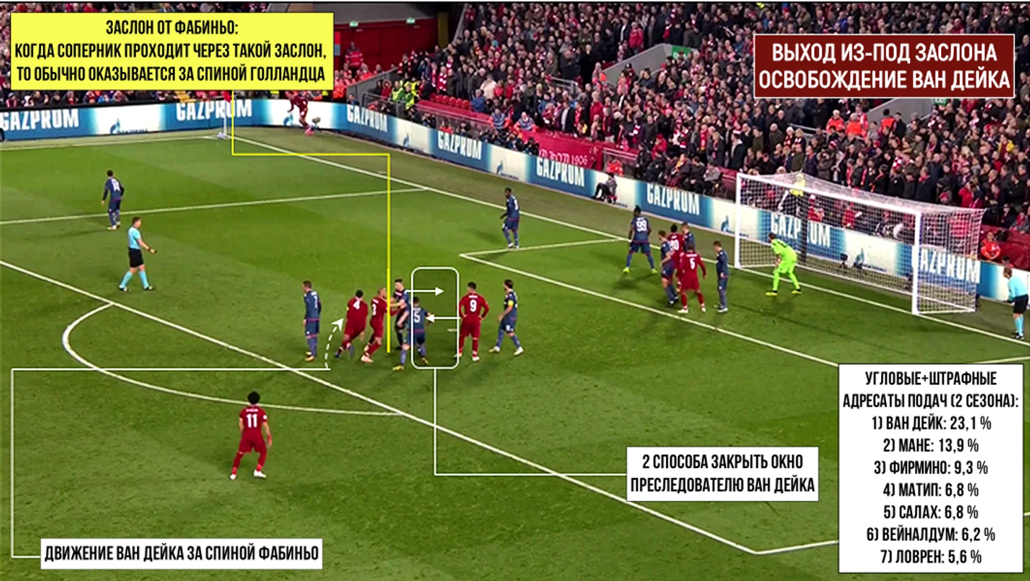 Очень важно пристально следить за расположением Ван Дейка еще до начала активной фазы стандарта. Защитник может начать ускоряться в разные стороны, иногда перед ним помещается кто-то из маленьких. Вот как это выглядит на примере Мане и Салаха: