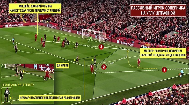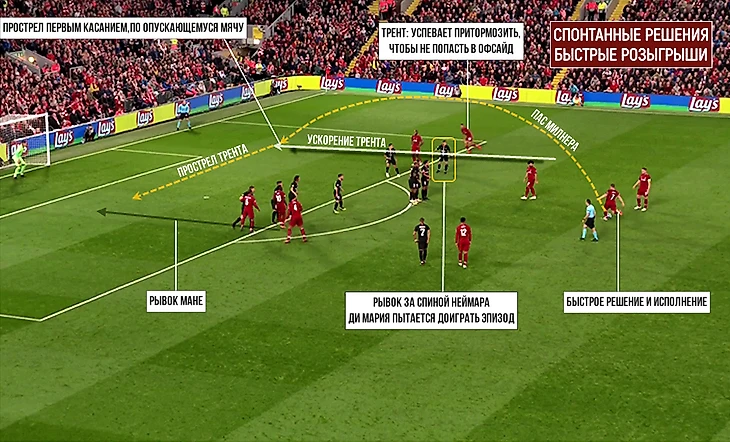 Трент первым из всех игроков переходит в динамику, его движение схватывает Милнер и тут же организует мягкий заброс, который Александер-Арнолд преобразует в прострел в середину, где импульс ускорения розыгрыша уже подхватил Мане. Ускорение ТАА вновь происходит за спиной Неймара и остается без внимания, Ди Мария разворачивается и пытается компенсировать ситуацию (естественно, опять не успевает).