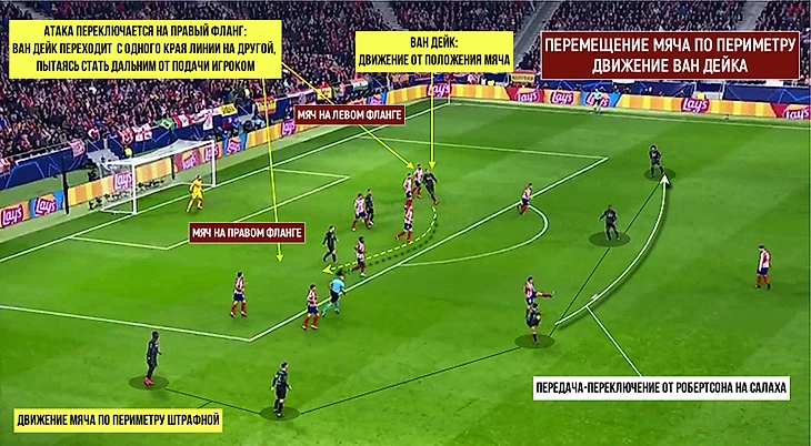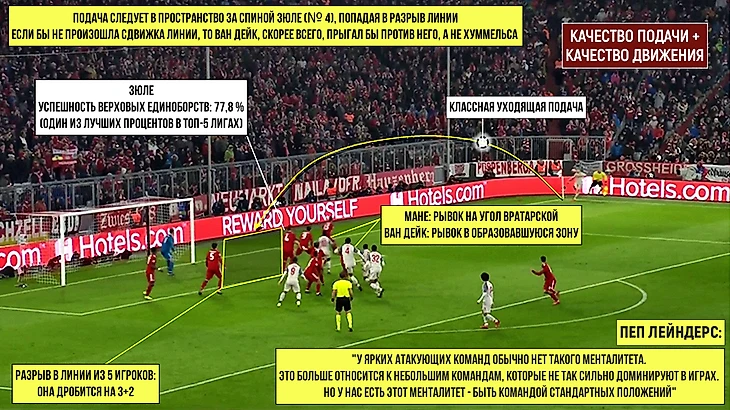 Несколько сочетающихся факторов привели к голу в ключевой момент в матче плэй-офф Лиги чемпионов: подача, движение и габариты Ван Дейка, образовавшийся разрыв в линии из пяти соперников, куда и ворвался на скорости голландец, неправильное прочтение траектории навеса защитниками.