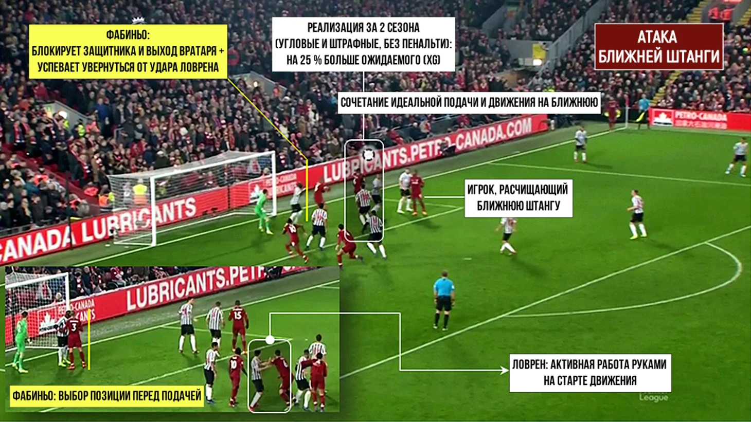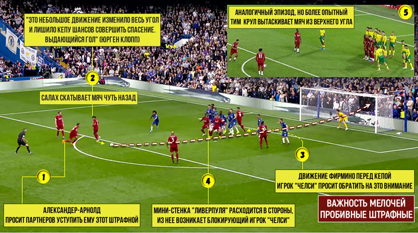 Пример пробивного штрафного удара, когда «Ливерпуль» насыщает полотно стандарта мелочами (Салах чуть смещает мяч, дополнительная стенка раскрывает створки, движение Фирмино перед вратарем), которые в сумме влияют на развитие ситуации и обзор: