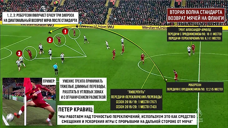 Мастера таких подач – фланговые защитники команды Клоппа, Робертсон и ТАА. Пример ситуации, когда после стандарта волна соперников поймана на агрессивном выходе из штрафной площади подачей Робертсона с преимуществом «Ливерпуля» в дальнем коридоре:
