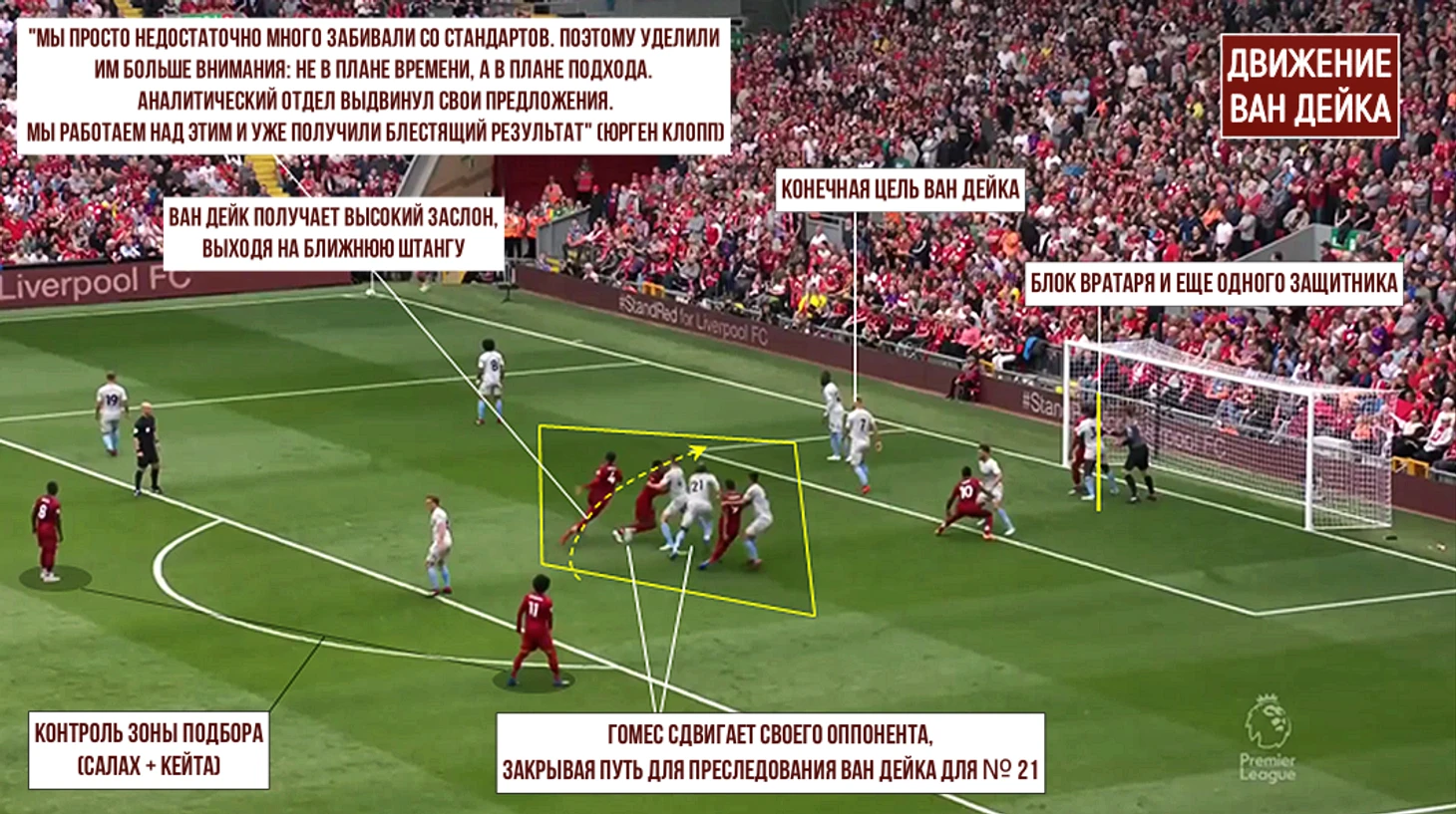 «Ливерпуль» способен пересобрать стандарт в новой конфигурации, когда группа игроков на периметре запирает соперника в его штрафной площади, а центральные защитники остаются на первой линии атаки. И здесь важно вновь отметить перемещения Ван Дейка: