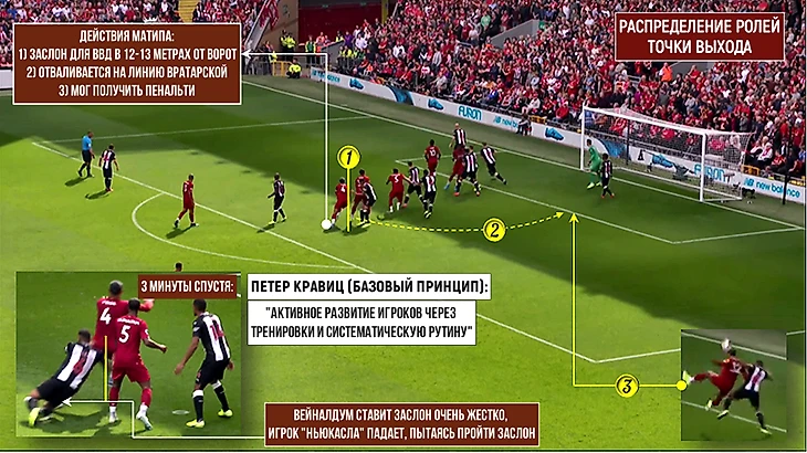 Причем Вейналдум делает это демонстративно жестко, сдвигаясь назад. Настолько, что игрок соперника, огибая его, теряет равновесие. Матип же действует в амплуа баскетбольного центрового, ставя заслон партнеру и проваливаясь в другом направлении (более того – подача в итоге пошла именно в его зону).