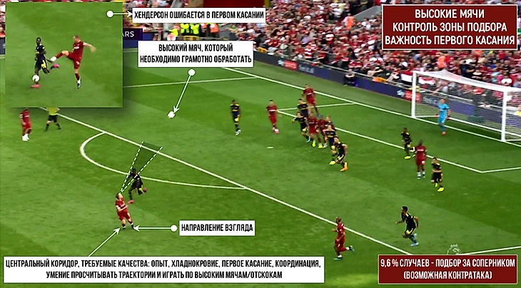 Второе ключевое качество – умение играть по высоким мячам, которые выносятся из штрафной, укрощать их и возвращать в угловые зоны для повторных навесов. Ошибки в этой стадии относятся к категории критических, потому что за спиной, как правило, только один страхующий игрок. Пример подобной ошибки (хотя в абсолютном большинстве аналогичных случаев Хендерсон действует достаточно четко):