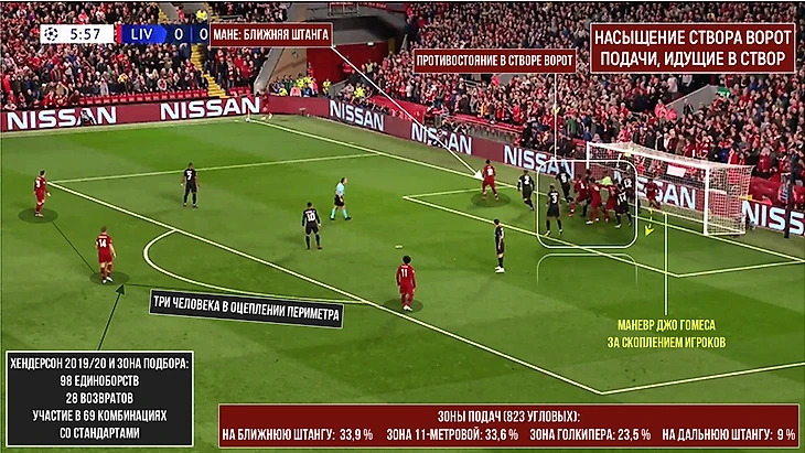 Способность «Ливерпуля» накрывать соперника дополнительными волнами после стандарта, пользуясь хаосом, потерей непосредственных оппонентов – неблагоприятное для соперника развитие событий. Голы и опасные моменты после подобных доигровок нельзя напрямую причислить к категории стандартных положений, но они – оружие, непосредственно вытекающее из ситуаций с подачами угловых и штрафных, против которых не менее тяжело защищаться. Когда «Ливерпуль» берет подбор и заново обостряет, конструкция обороны противника еще не всегда сформирована, что приводит к подобным ситуациям: