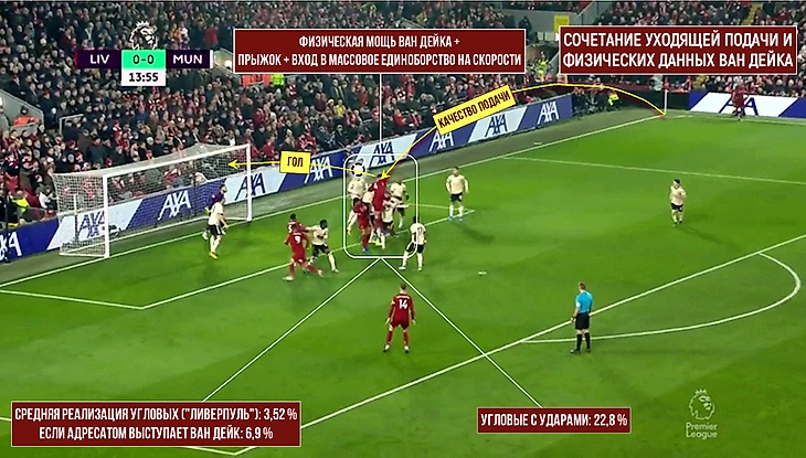 Если Ван Дейка освободили, а подача исполнена качественно и в нужную зону, то остановить защитника очень тяжело: часто он несется в зону и идет в лобовое столкновение с целой группой соперников или сминает оппонента, отвечающего за конкретную зону. Как показывают цифры реализации, эффективность угловых «Ливерпуля» повышается почти в два раза, если адресатом выступает Вирджил, а не кто-то другой.