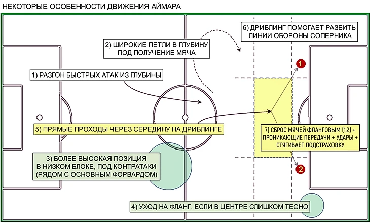• отголоски уличного футбола и плохих полей в детстве: убирал мяч под стопу как в банковскую ячейку, лез в минимальные пространства, одно-два касания при разворотах вокруг оси. На Аймара нужно было переключаться сразу либо действовать превентивно, особенно обороняясь от зарождающегося прохода;