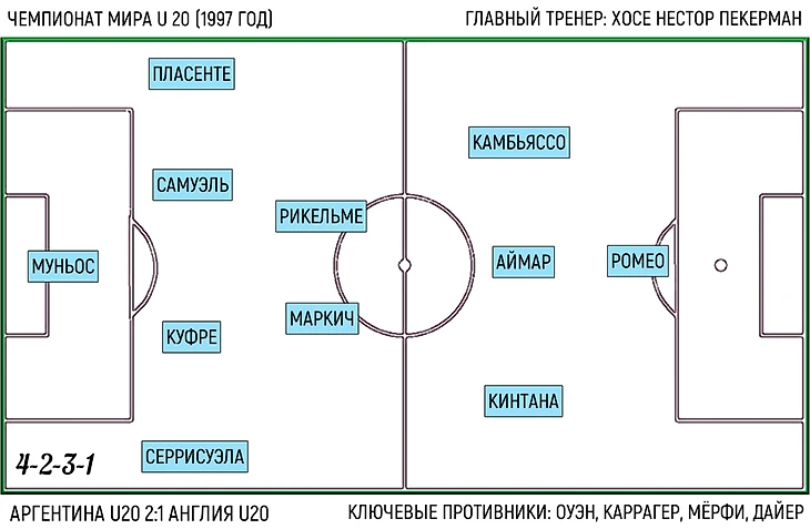 Чтобы понять величину временной пропасти, забавный факт: в той игре Эстебан Камбьяссо бегал на фланге и с длинными волосами. На этом турнире и зародилась дружба Романа и Пабло. Пекерман поступил мудро, раздвоив угрозу, отдав полномочия восьмерки Рикельме и поставив Аймара на любимой позиции, десяткой.
