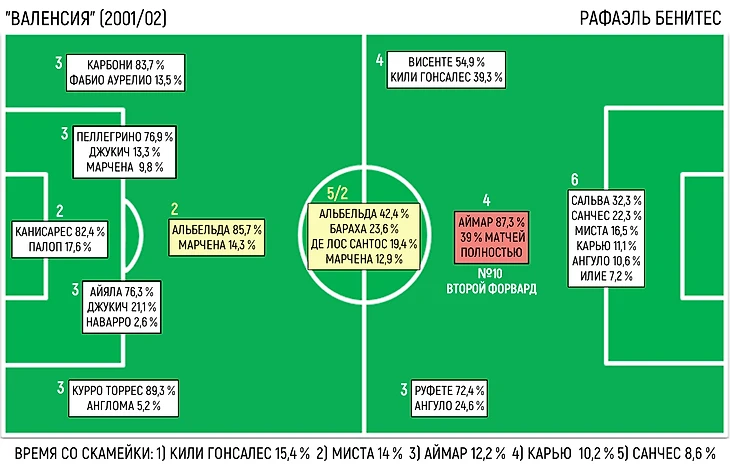 Вторая часть сезона 2001/02 – лучший Пабло Аймар за всю карьеру (по его собственному мнению). Вот та команда, с распределением игрового времени в старте, по каждой позиции или блоку схемы: