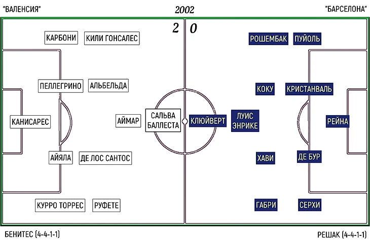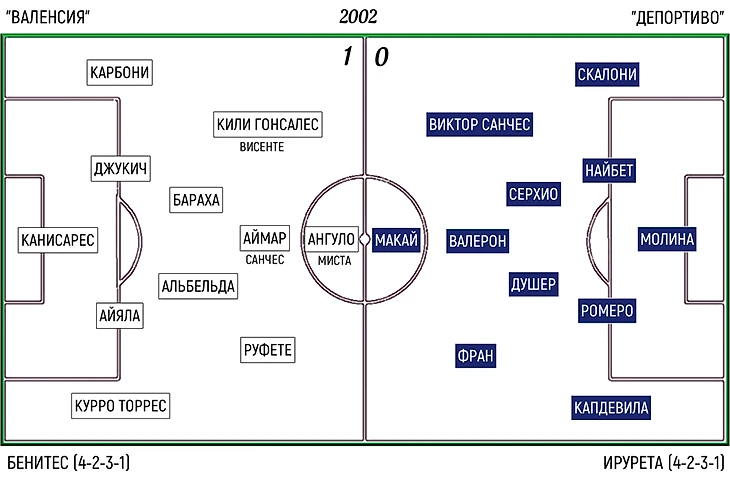 Испанская партия, где зеркало Аймара в составе соперника – Хуан Карлос Валерон. Черты той «Валенсии»: трудовая этика + темп + методичность удушения. Краеугольный вопрос матча: «Кто эффективнее оставит плэймейкера соперника без мяча?»