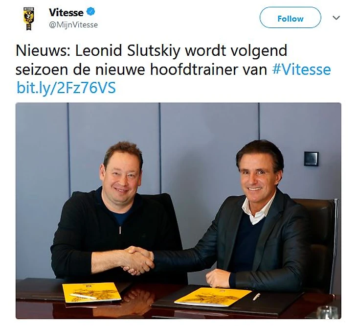 Новости: Леонид Слуцкий стал новым главным тренером "Витесса" в следующем сезоне, - гласит надпись над фотографией, опубликованной на официальной странице клуба в Твиттере.