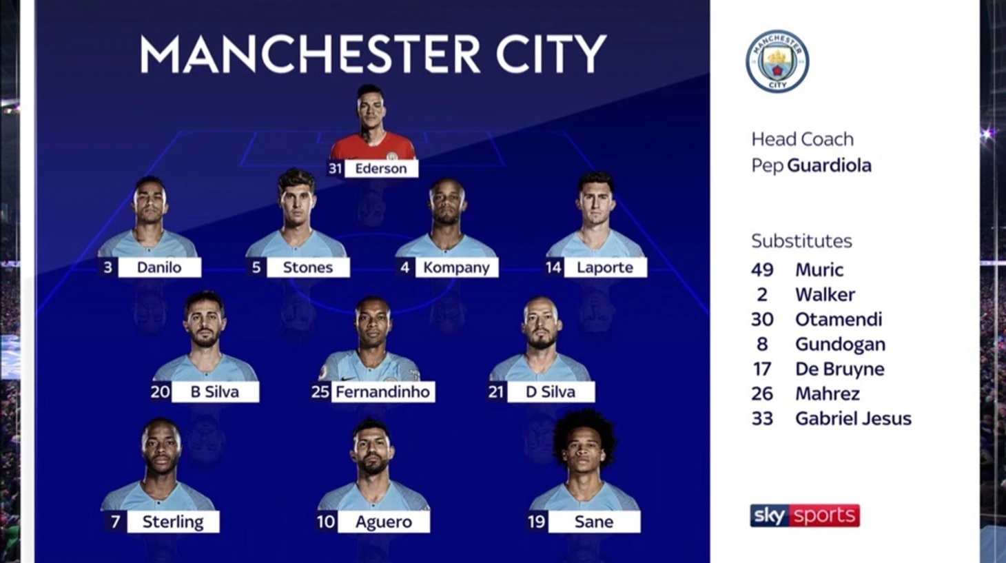 "Манчестер Сити". В стартовый состав "горожан" вернулись Джон Стоунс и Лерой Сане, заменив Александра Зинченко и Рияда Махреза. Кевин де Брюйне остался в запасе. Фабиан Делф дискалифицирован.