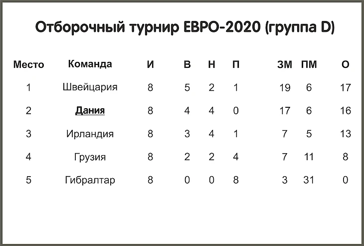 За право участвовать на финальной стадии Евро-2020 датчанам выпалпа честь побороться со сборными Швейцарии, Ирландии, Грузии и Гибралтара.