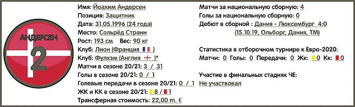 При этом на все позиции есть основные футболисты, которые будут начинать турнир, и игроки подмены, так что уже сейчас можно с практически 100% гарантией утверждать, что защитная линия будет состоять из Йоакима Мэле («Аталанта»), Симона Кьера («Милан»), Андреаса Кристенсена («Челси») и Даниэля Васса («Валенсия»).