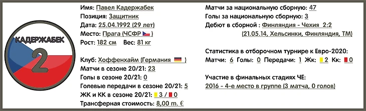 Так, слева у чехов будет играть либо Ян Боржил из пражской «Славии», либо Алеш Матею из итальянской «Брешии», на 2 позиции в центре защиты претендуют сразу 3 игрока - Ондржей Челюстка («Спарта»), Павел Кадержабек («Хоффенхайм») и Томаш Калас («Бристоль Сити»), ну а справа точно играть будет Владимир Цоуфал из английского «Вест Хэм Юнайтед».