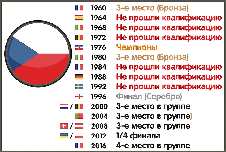Да и наград на этих первенствах у чехов предостаточно - чемпионство в 1976-м (тогда еще объединённой сборной Чехословакии), серебро в 1996-м и сразу три комплекта бронзовых медалей (1960, 1980 и 2004).