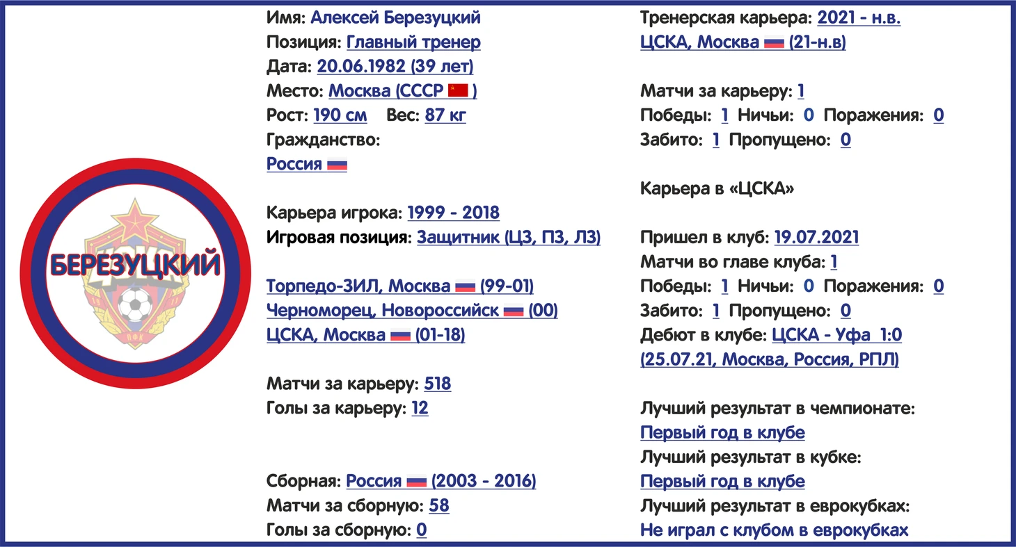 Думаю что особенно расписывать игровую карьеру Алексея Березуцкого не имеет смысла, все же это тренерский раздел, да и большинству любителей футбола скорее всего биография нового наставника «ЦСКА» известна - один из лучших защитников в стране на протяжении последних 20 лет, вместе с «ЦСКА» завоевал огромное количество наград, включая победы в 6 чемпионатах России, является обладателем 7 Кубков и 6 Суперкубков страны, а в сезоне 2004/2005 поднимал над своей головой одну из самых ценных наград в истории всего российского футбола в целом - Кубок УЕФА.