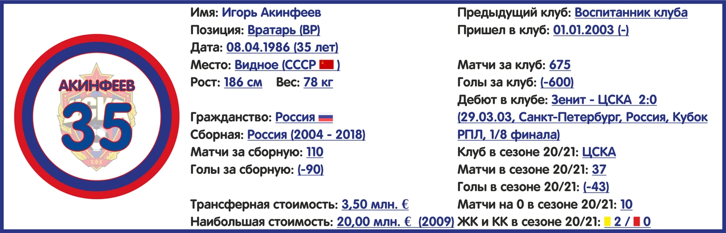 Игорь Акинфеев - 486 матчей (2003 - н.в.)