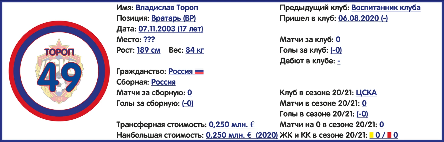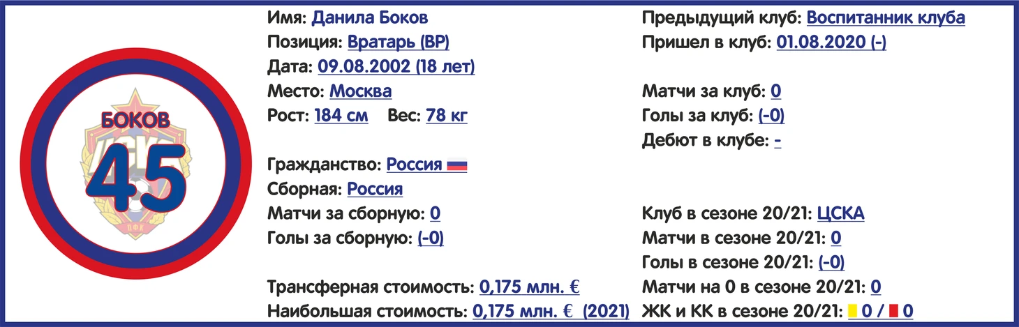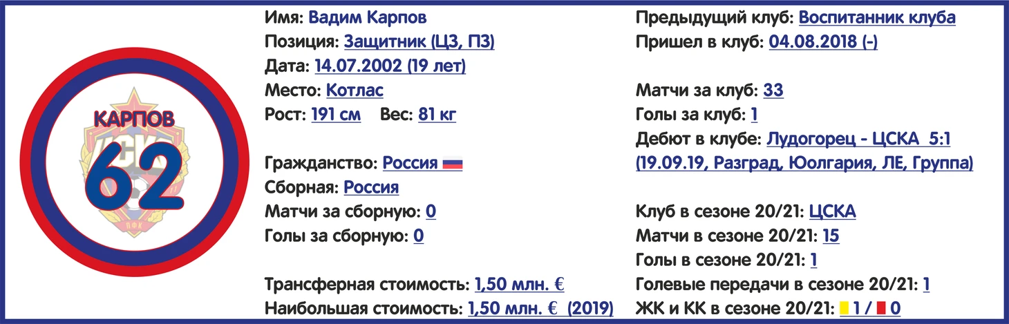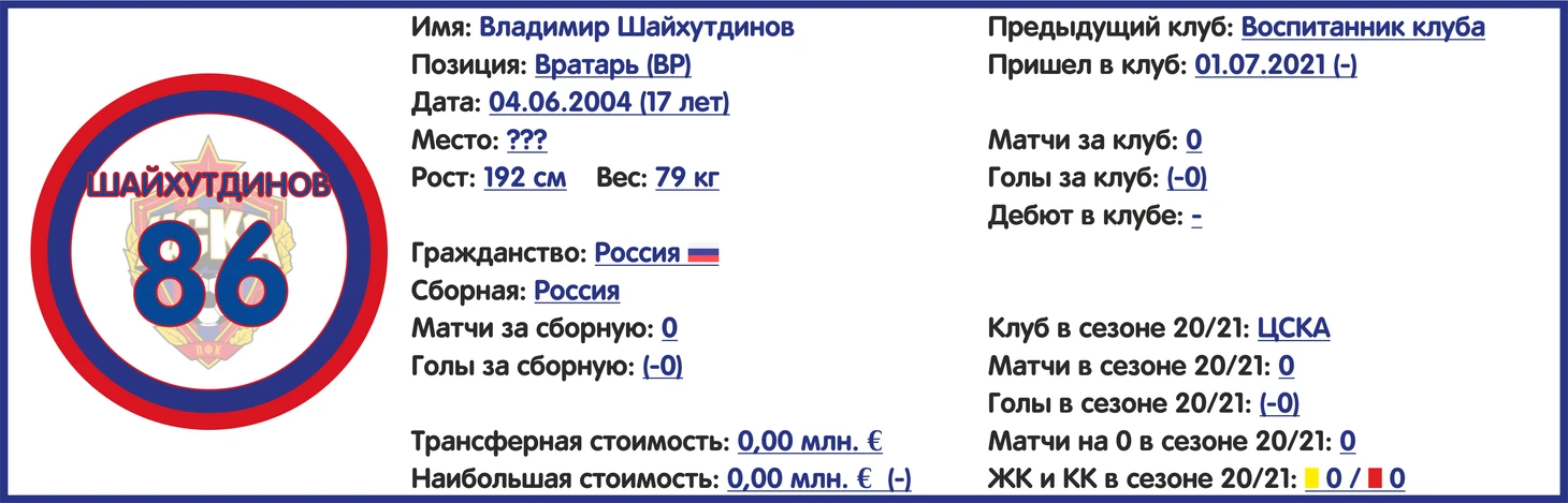 Молодой голкипер красно-синих, которого в его 17 лет считают наследником Игоря Акинфеева и будущим многолетним стражем ворот «ЦСКА» (сам Игорь дебютировал во взрослом футболе за 8 месяцев до рождения Владислава).