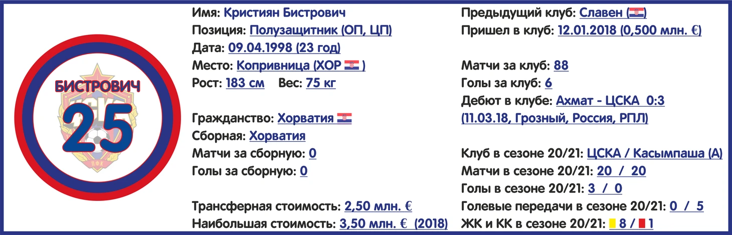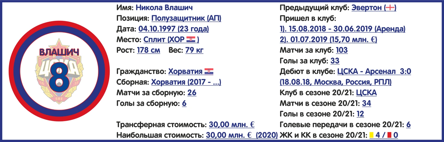 Никола Влашич является ключевым игроком «ЦСКА» в плане построения игры в атаке, при это и сам он частенько отличается забитыми мячами (33 гола в 103 играх весьма достойный результат).