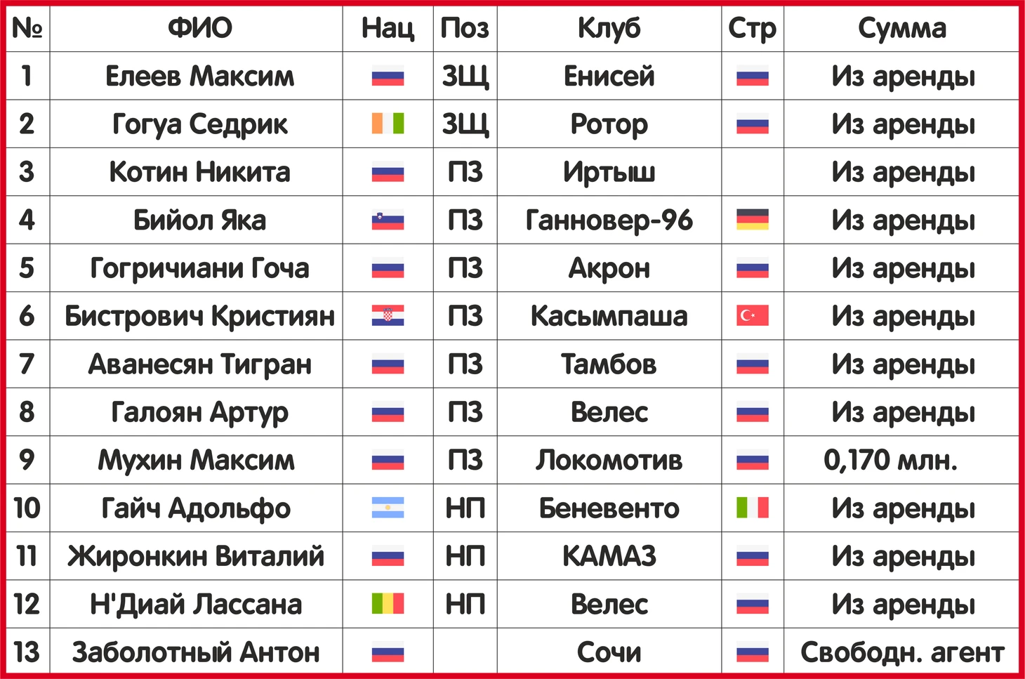 При этом клуб достаточно неплохо поработал на российском рынке, подписав за символическую сумму одного из самых одаренных молодых игроков России Максима Мухина (из «Локомотива»), а также усилил свой атакующий потенциал, вернув в родные пенаты нападающего Антона Заблолотного, последние два сезона игравшего в «Сочи».