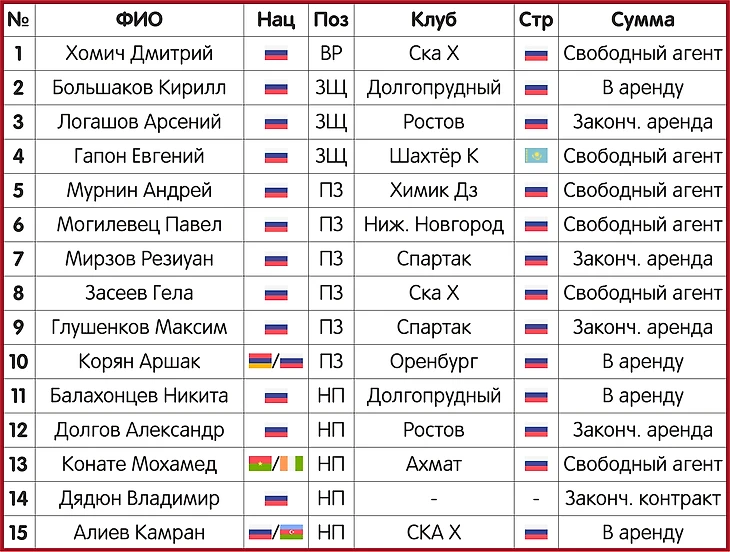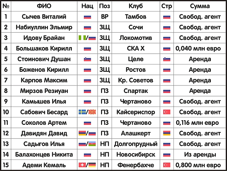 Покинула клуб целая россыпь игроков, однако особенно отмечу достаточно неожиданные уходы в аренду Аршака Коряна («Оренбург») и Камрана Алиева (хабаровский «СКА»), завершение арендных соглашений с Максимом Глушенковым («Спартак»), Александром Долговым («Ростов») и Арсением Логашовым (тоже «Ростов»), а также непродление контракта с нападающим Владимиром Дядюном и уход в «Ахмат» на безвозмездной основе еще одного форварда Мохамеда Конате, к которому совсем недавно добавился и еще один игрок атаки Сенин Себаи.