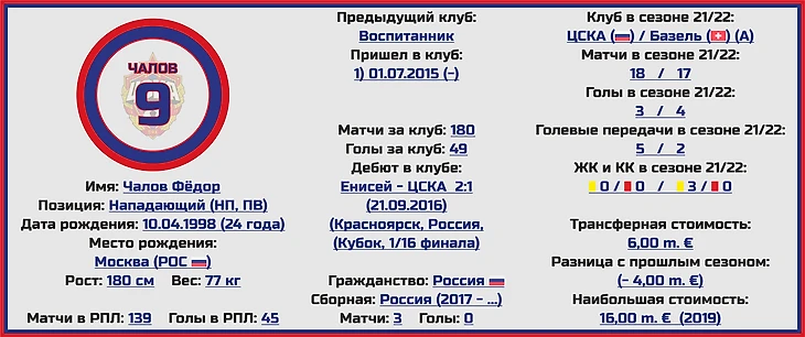 • В Суперлиге на счету нападающего 14 матчей и 4 забитых мяча, не сказать что поездка оказалась сверхудачной, однако вполне могла помочь игроку в моральном плане, ведь он почувствовал на себе, что такое игра в Европе (пусть и не в самом сильном чемпионате), теперь же у Чалова есть определенная цель туда вернуться, а для этого нужно как можно лучше выступить за «ЦСКА», тем более на него в этом сезоне может быть сделана большая ставка.