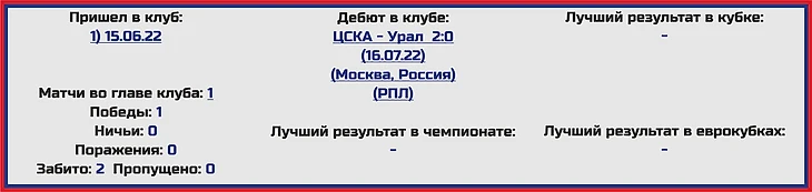 • Ничем особенным его правление на капитанском мостике «Урала» не закончилось, можно разве что упомянуть странный ничейный синдром команды под его руководством (14 ничьих в 27 встречах чемпионата).