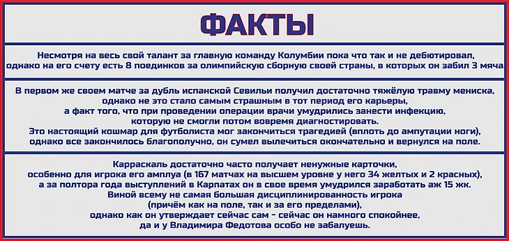 • Минусами можно назвать травматичность и достаточно большое количество потерь мяча (что логично, учитывая манеру игры колумбийца).