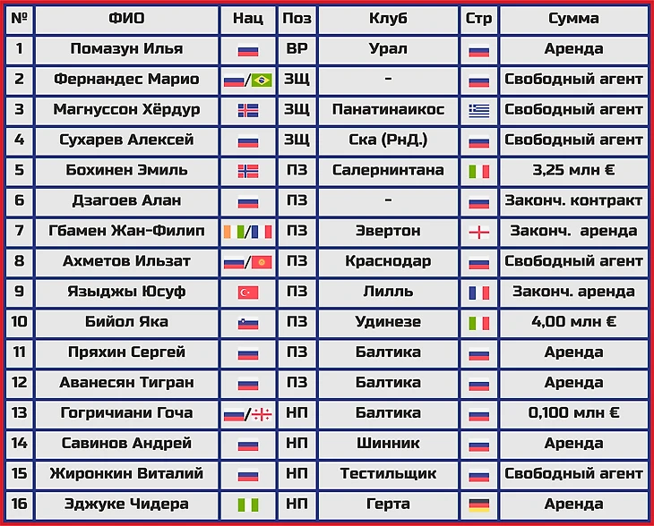 • Помимо этого коллектив смог неплохо заработать на продаже в Италию двух своих легионеров - словенца Яка Бийола (в «Удинезе») и норвежца Эмиля Бохинена (в «Салернинтану»), не стал продлевать или выкупать аренды полузащитников Филипа-Жана Гбамена и Юсуфа Языджи (оба вернулись  в свои прежние клубы - английский «Эвертон» и французский «Лилль», соответственно), а также расстался по обоюдному согласию с Хёрдуром Магнуссоном (ушел в греческий «Панатинаикос») и Ильзатом Ахметовым (закончился контракт, игрок в итоге будет выступать теперь за «Краснодар»).