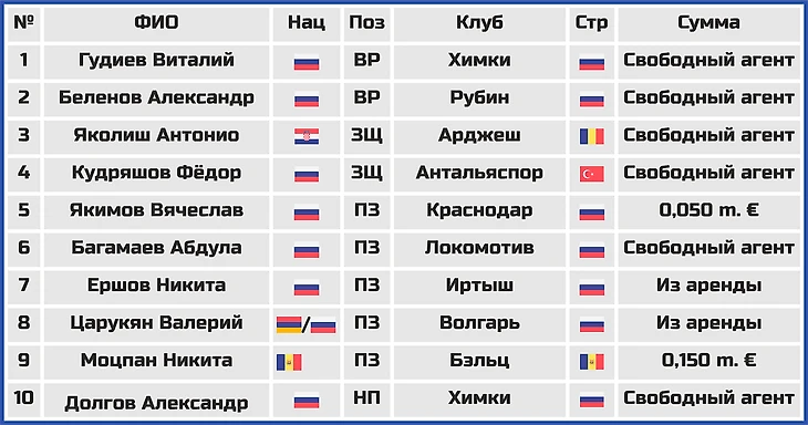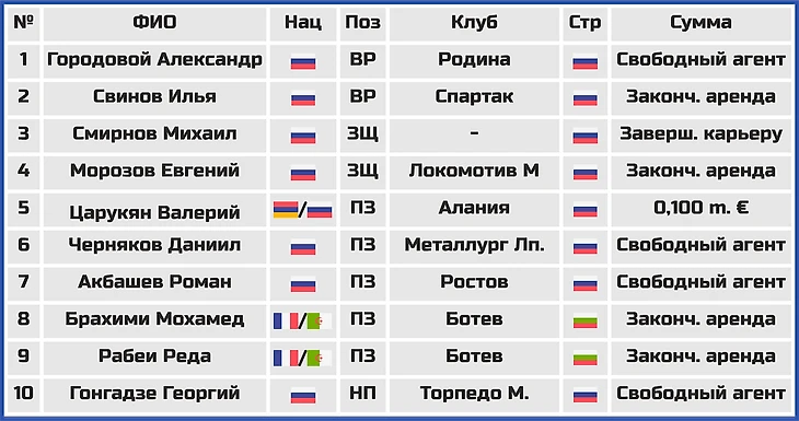 Опять же про голкиперов писалось выше, но и помимо них потерь много - Евгений Морозов после годичной аренды вернулся в родной «Локомотив», Роман Акбашев перешел в «Ростов», а Георгий Гонгадзе в московское «Торпедо», плюс завершились аренды из болгарского «Ботева» полузащитников Мохамеда Браими и Реды Рабеи.
