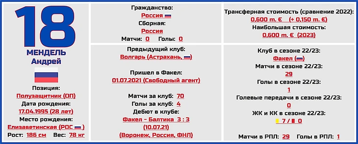 Андрей Мендель является одним из главных коллекционеров желтых карточек в российском футболе (на его счету во всех лигах уже 74 жк в 258 играх ПФЛ, ФНЛ и РПЛ).