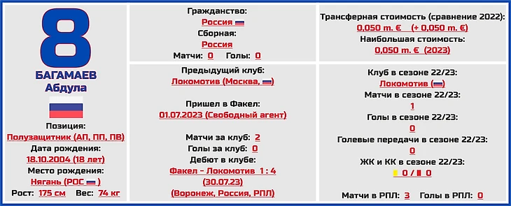 Абдула Багамаев является пока единственным футболистом до 19 лет, кто получает хоть какое-то время в составе воронежского «Факела» (на данный момент атакующий игрок провел на футбольном поле порядка 23 минут).