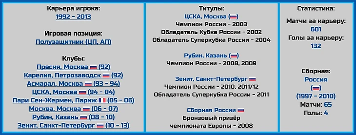 За свою карьеру успел сменить уже не один клуб - «Чертаново», «Спартак», «Химки», «Крылья Советов» и «Локомотив», и практически везде был одним из лидеров (кроме, разве что, периода в стане «красно-белых», где по многим причинам заиграть не удалось).