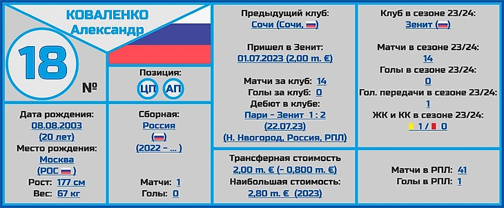 К своим 20 годам Александр Коваленко провел уже более 50 матчей в российском футболе, успев поиграть за самарские «Крылья Советов», футбольный клуб «Сочи» из одноименного города и, собственно, Зенит из Санкт-Петербурга.