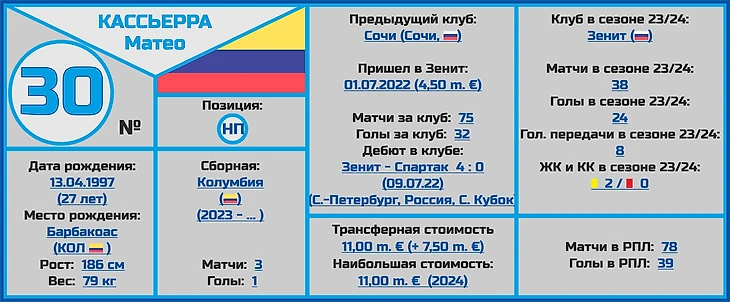 В распоряжении тренерского штаба Сергея Семака на данный момент, помимо Кассьерры, также имеется россиянин Иван Сергеев (тоже весьма результативный нападающий, но пока уступающий своему конкуренту), а так же француз Вильсон Изидор, хотя его скорее больше будут использовать не в качестве именно центрального форварда.