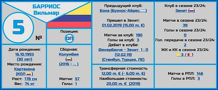 В прошлом сезоне «Зенит» пропустил в чемпионате всего 27 мячей за 30 сыгранных туров, что является лучшим показателем среди всех клубов РПЛ, и огромная заслуга в этом именно Барриоса.