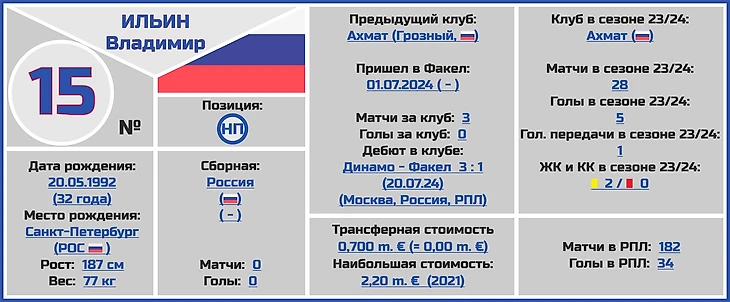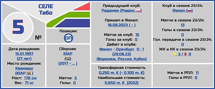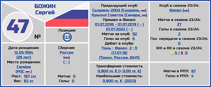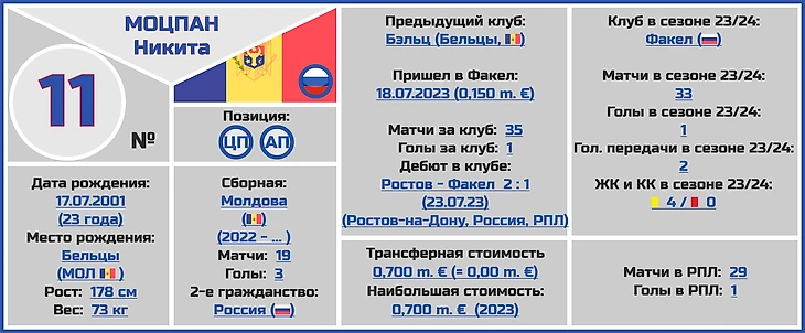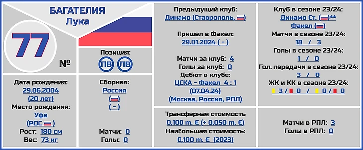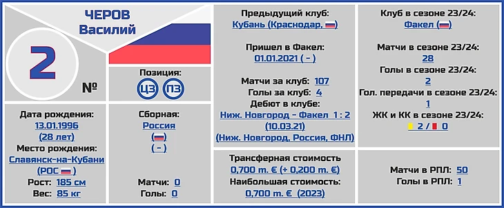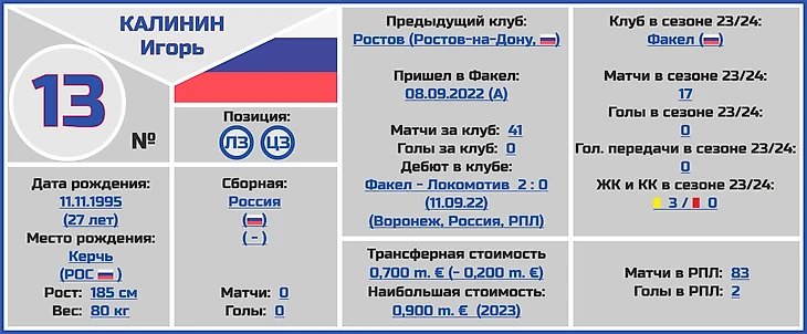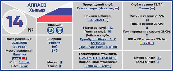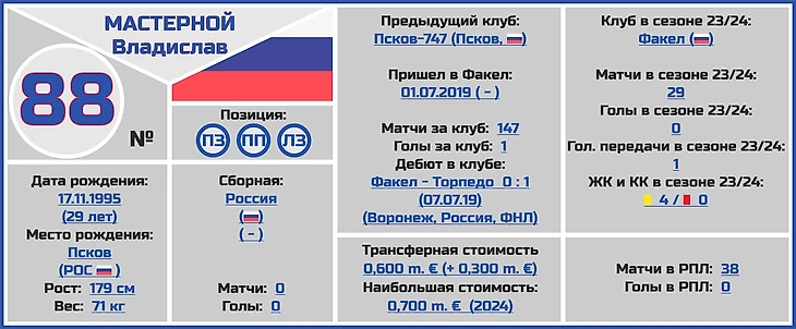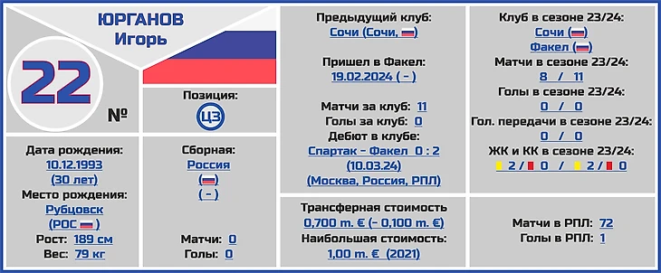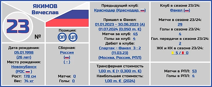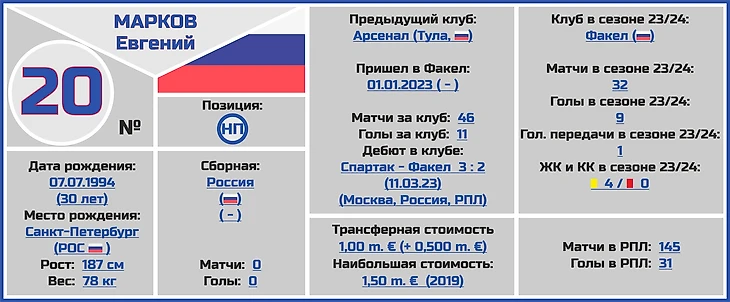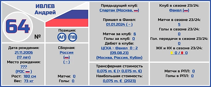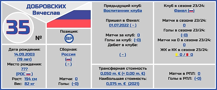 Все трансферные суммы переходов и оценки стоимости игроков и клубов взяты с сайта www.transfermarkt.world, вся информация по поводу правильного написания ФИО даты и места рождения, веса и роста футболистов по большей части с официальных сайтов клубов РПЛ.