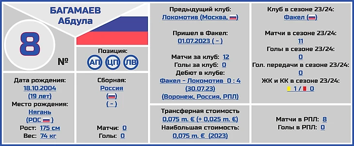 Абдула Багамаев является одним их немногих молодых футболистов клуба, кто получает хоть какое-то время в составе воронежского «Факела» (на данный момент атакующий полузащитник провел в майке воронежцев 12 встреч).