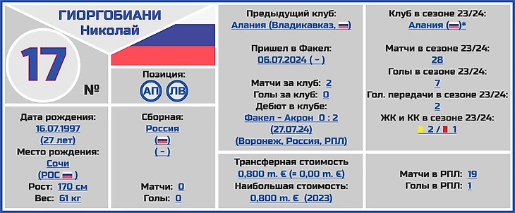 Николай Гиоргобиани является вполне себе состоявшимся 27-летним футболистом, который достаточно долгое время являлся одним из лидеров владикавказской «Алании» в Первой Лиге, но до сих пор так еще и не заявившим о себе в главной Лиге страны (в его активе до этого сезона было несколько игр на высшем уровне за «Уфу», но особо запомниться широким массам он по ним не смог).