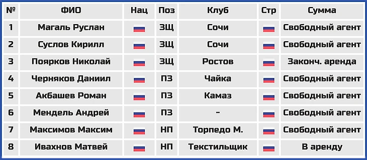 Расстался же клуб с некоторыми, можно сказать, действующими легендами команды последних лет, которые выводили клуб еще из Первой Лиги (в первую очередь речь идет о таких игроках как Руслан Магаль, Кирилл Суслов, Роман Акбашев, Андрей Мендель и Максим Максимов).