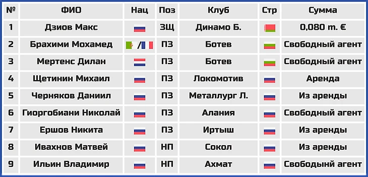 Из важных трансферов отмечу переход в команду голландца Дилана Мертенса, возвращение совсем недавно уже игравшего за Факел алжирца Мохамеда Брахими, а так же приходы в клуб защитника Макса Дзиова, полузащитников Михаила Щетинина и Николая Гиоргобиани, а так же форварда Владимира Ильина.