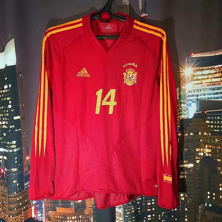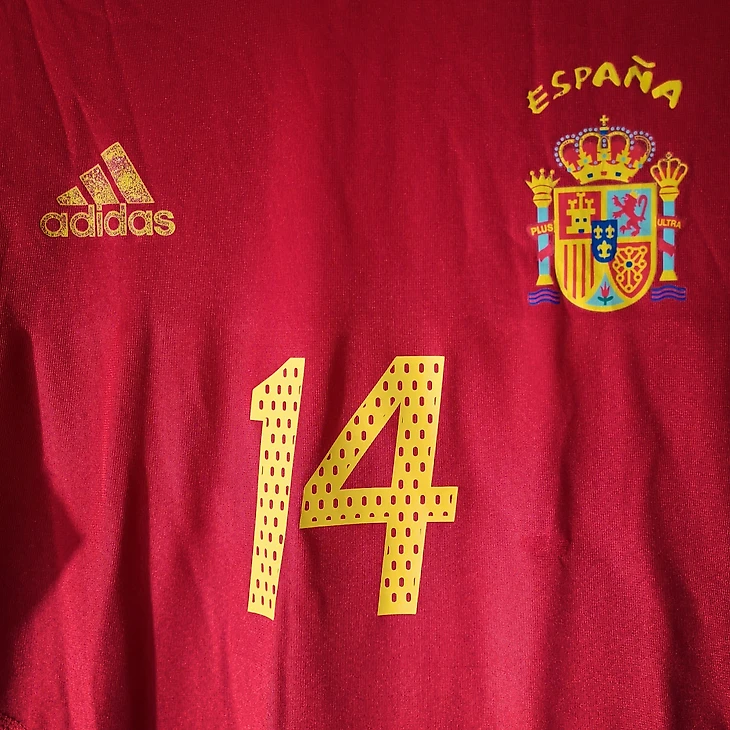 По традиции, на игровых вариантах все нанесения - плёнка и термотрансферы. Лого adidas, испанской федерации футбола - термотрансферы. Лампасы и фамилия с номером- плёнкой. По сути шаблоны adidas и nike 2002-2004 задают тренды недолговечных игровых маек. От фирмового винтажа 90х не остаётся и следа, а маечная индустрия выходит на новую орбиту.