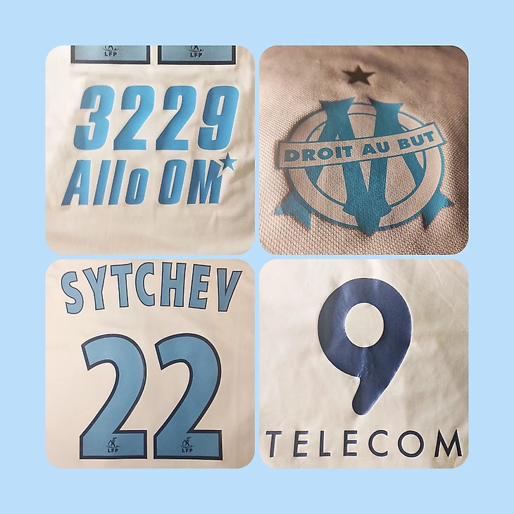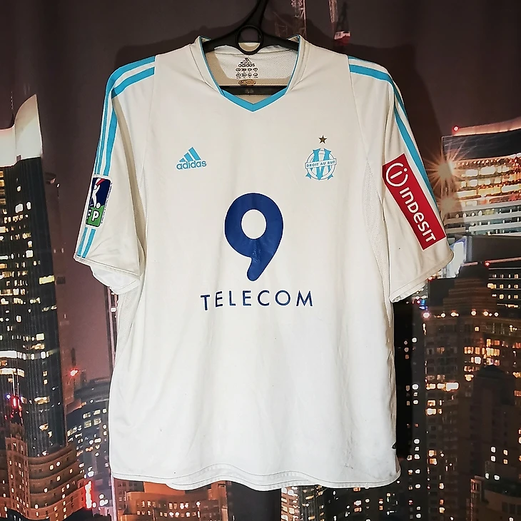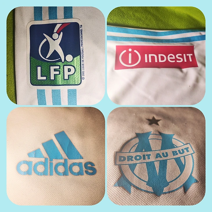 • Итак, игровая версия от adidas, сезон 2003 / 2004Классические для Марселя бело-голубые цвета. Технология ClimaCool. Двуслойный вариант футболки, с вшитой внутрь сетчатой майкой. Сетчатые вставки по бокам обеспечивали легкость и комфорт. В отличии от магазинных реплик нет никакой вышивки, все нанесения по традиции того сезона нанесены плёнкой и термотрансфером.