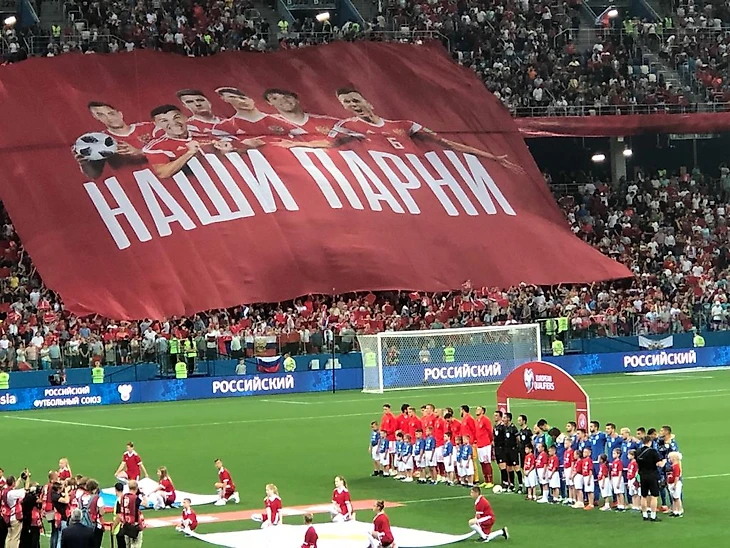 Под громкие крики: Россия! Россия! Россия! началась игра. Трибуны в едином порыве гнали сборную, требуя гол. Дважды мяч в ворота киприотов был отменен из-за офсайда, но это заставило болельщиков еще сильнее поддерживать сборную. И после гола, чистого гола Алексея Ионова на трибунах понеслась волна.